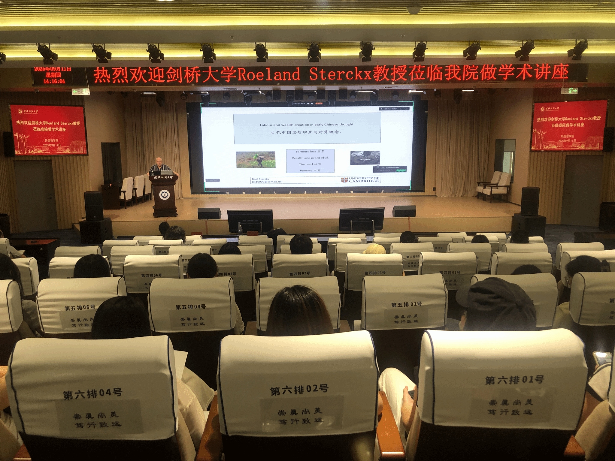 9月11日下午,世界著名科学家来鄂讲学计划专家、著名汉学家英国剑桥大学Roeland Sterckx教授在建全会堂稳健厅作了题为“Labour and wealth in early Chinese thought”(“古代中国思想职业与财势概念”)的学术讲座。讲座由院长谭燕保教授主持,外国语学院部分教师及英语专业和商务英语专业本科生参加。