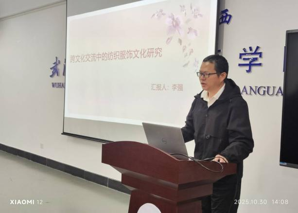 10月30日下午,外国语学院举办首场科研读书会活动,武汉纺织大学期刊社副编审、服装学院硕士生导师李强博士应邀做了精彩的主旨报告:跨文化交流中的纺织服饰文化研究。读书会由副院长刘方荣主持,外国语学院全体老师参加读书会并聆听了此次报告。