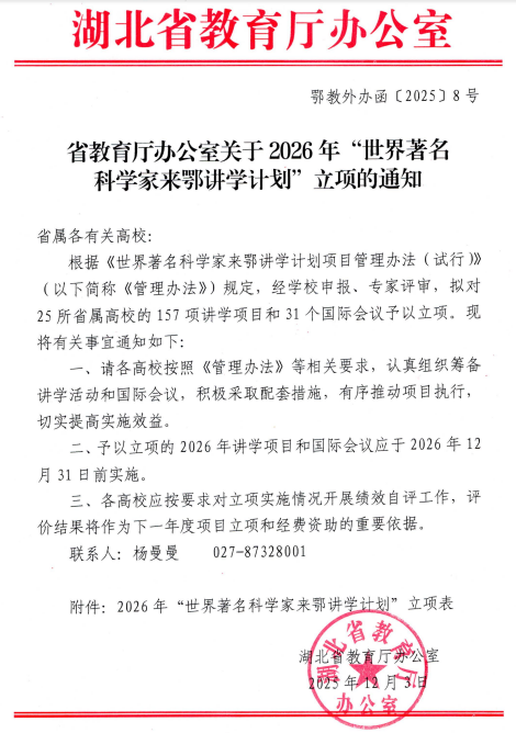 近日,湖北省教育厅公布了2026年度“世界著名科学家来鄂讲学计划”立项名单,我校外国语学院申报的项目成功获批。这是该学院自2024年度以来,连续第三年获此立项,充分彰显了学院在国际学术交流领域的持续影响力和扎实的工作成效。