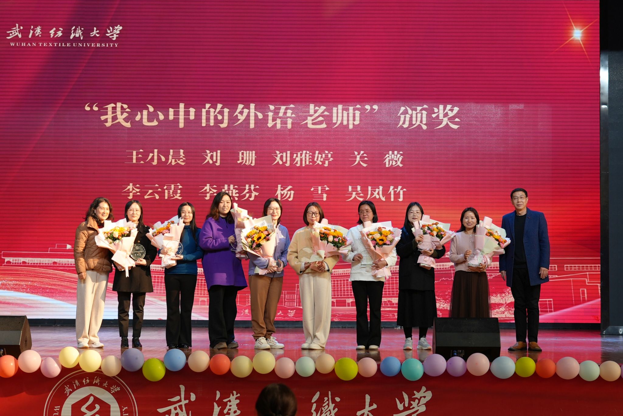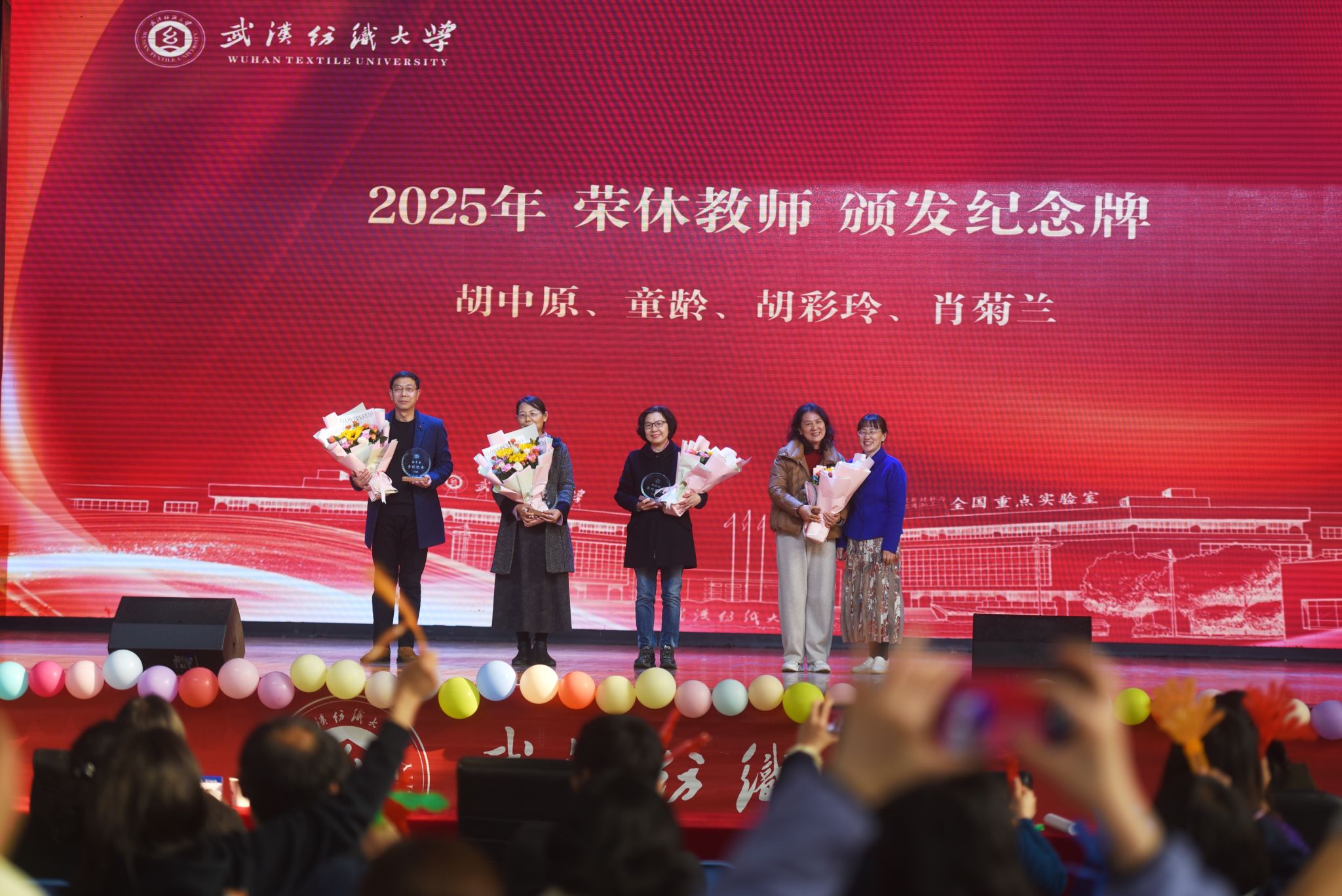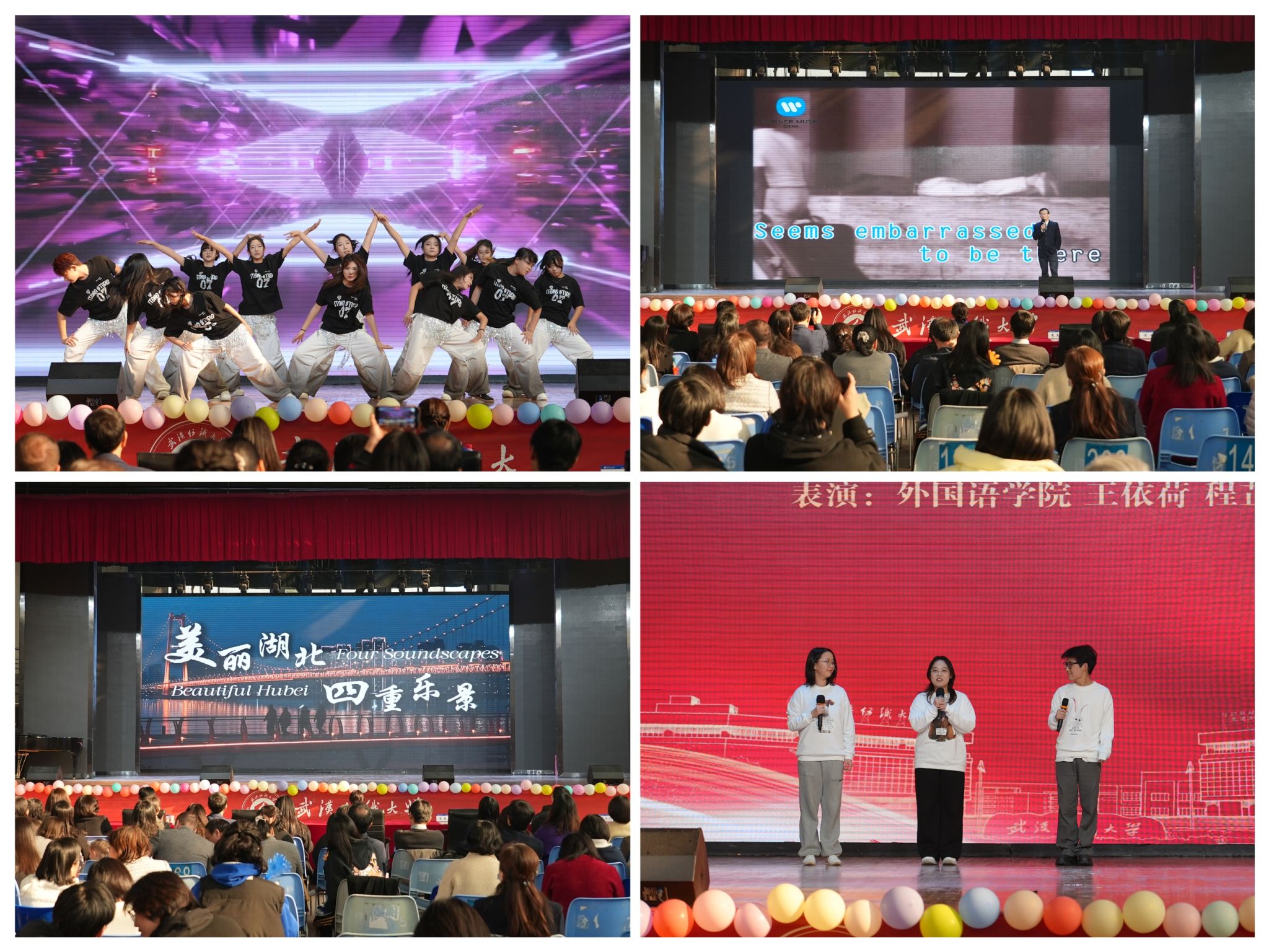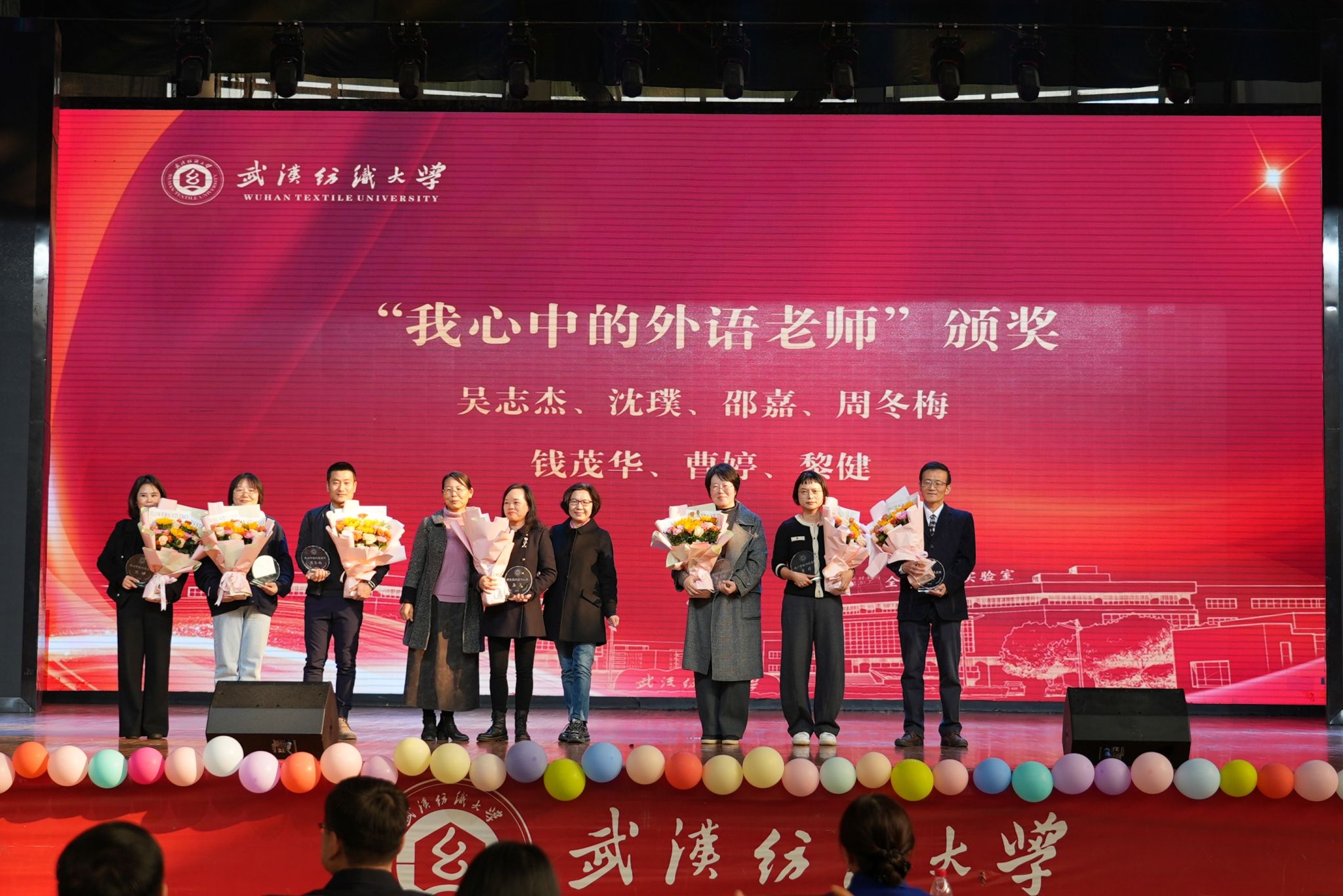 第二篇章“艺韵交织,四海和鸣” 凸显了中外文化的交融互鉴。教师英文独唱 Another Day in Paradise 深情动人;视频展示《“美丽湖北”印象之四重声景》以多语言音画描绘荆楚风韵;爵士舞《破界》与英语配音《爱宠大机密》则分别以现代舞姿和声音演技,展现了青年学子的创新活力与语言驾驭能力。本篇章特别设置了温情环节——谭燕保院长为2025年度荣休教师颁发纪念牌,致敬老师们数十载的耕耘与奉献;荣休教师代表胡中原、童玲、胡彩玲、肖菊兰相继为当选“我最喜爱的外语老师”的获奖教师颁奖,师道传承,感人至深。