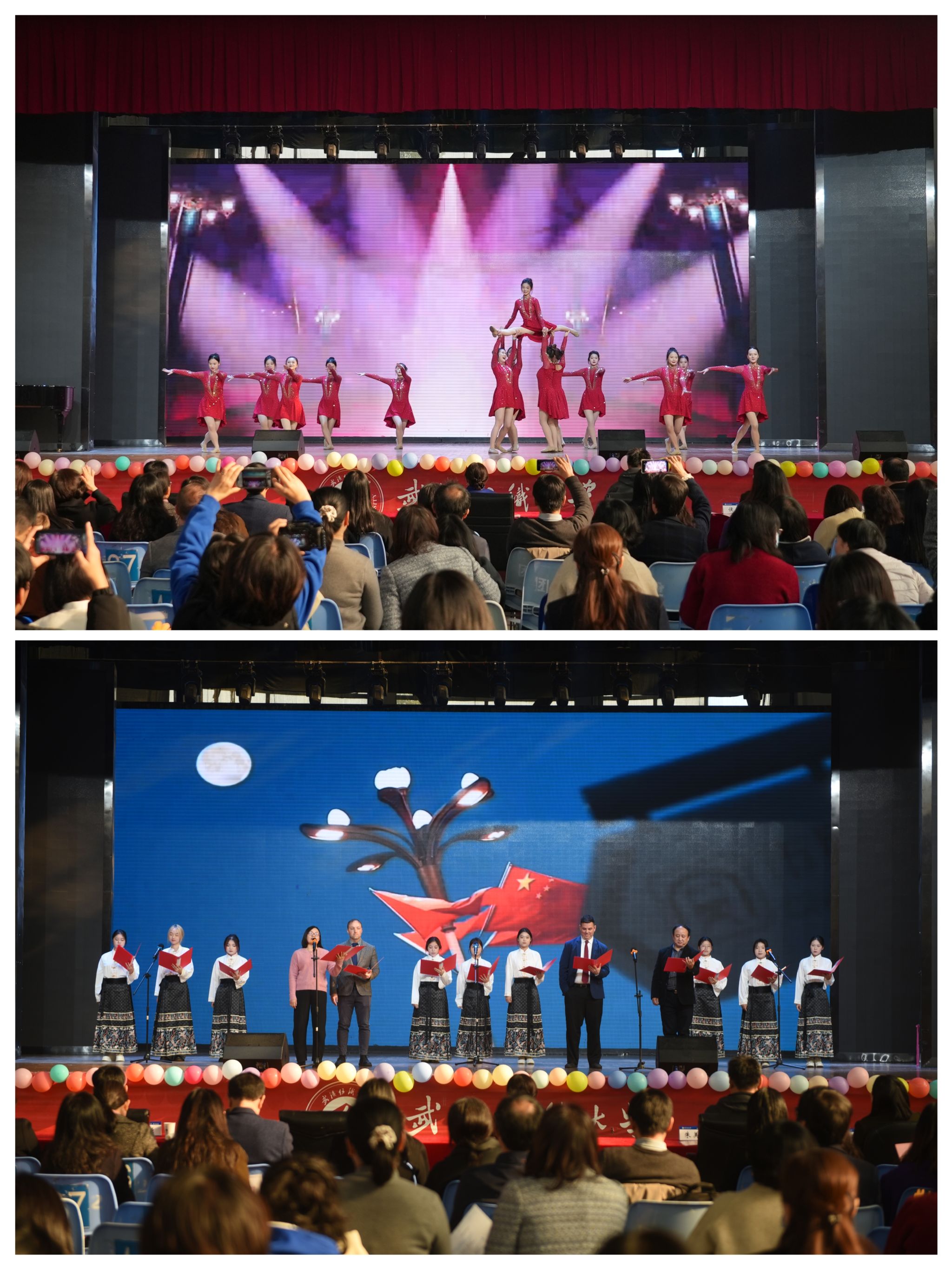 第一篇章“华章启幕,声动纺大”中,师生带来的朗诵 Youth以铿锵之声演绎青春誓言;啦啦操Beat Heat 则展现了力与美的结合,瞬间点燃全场热情。