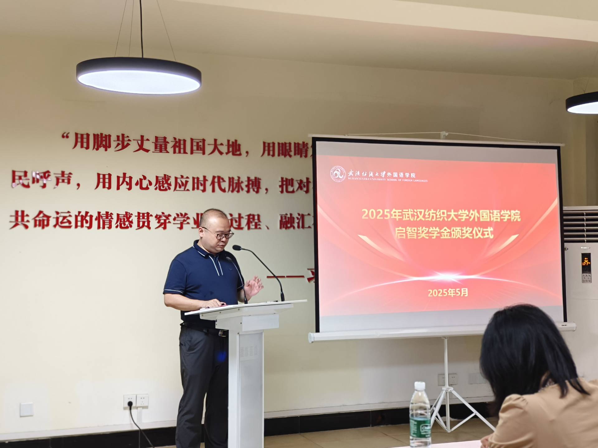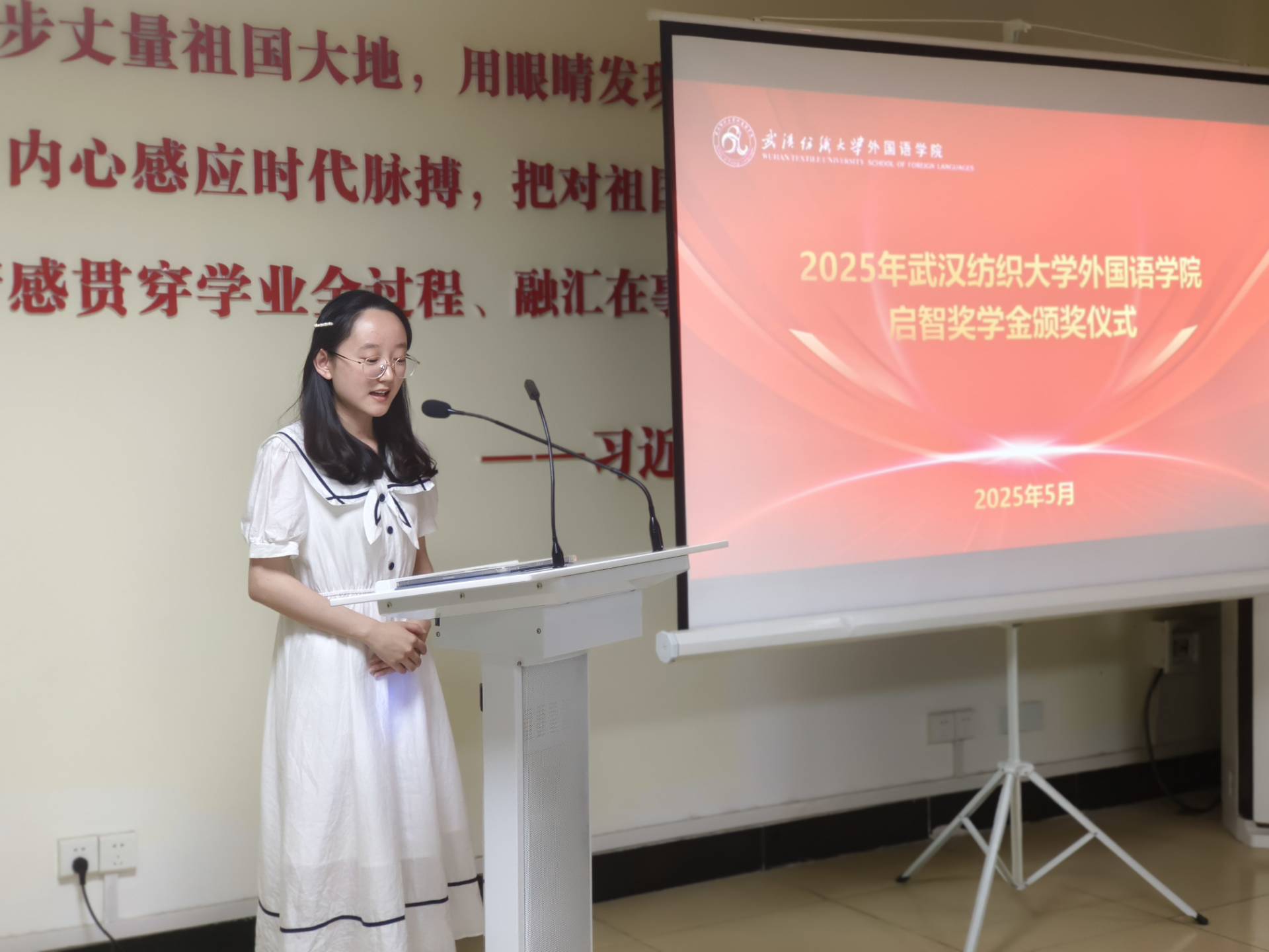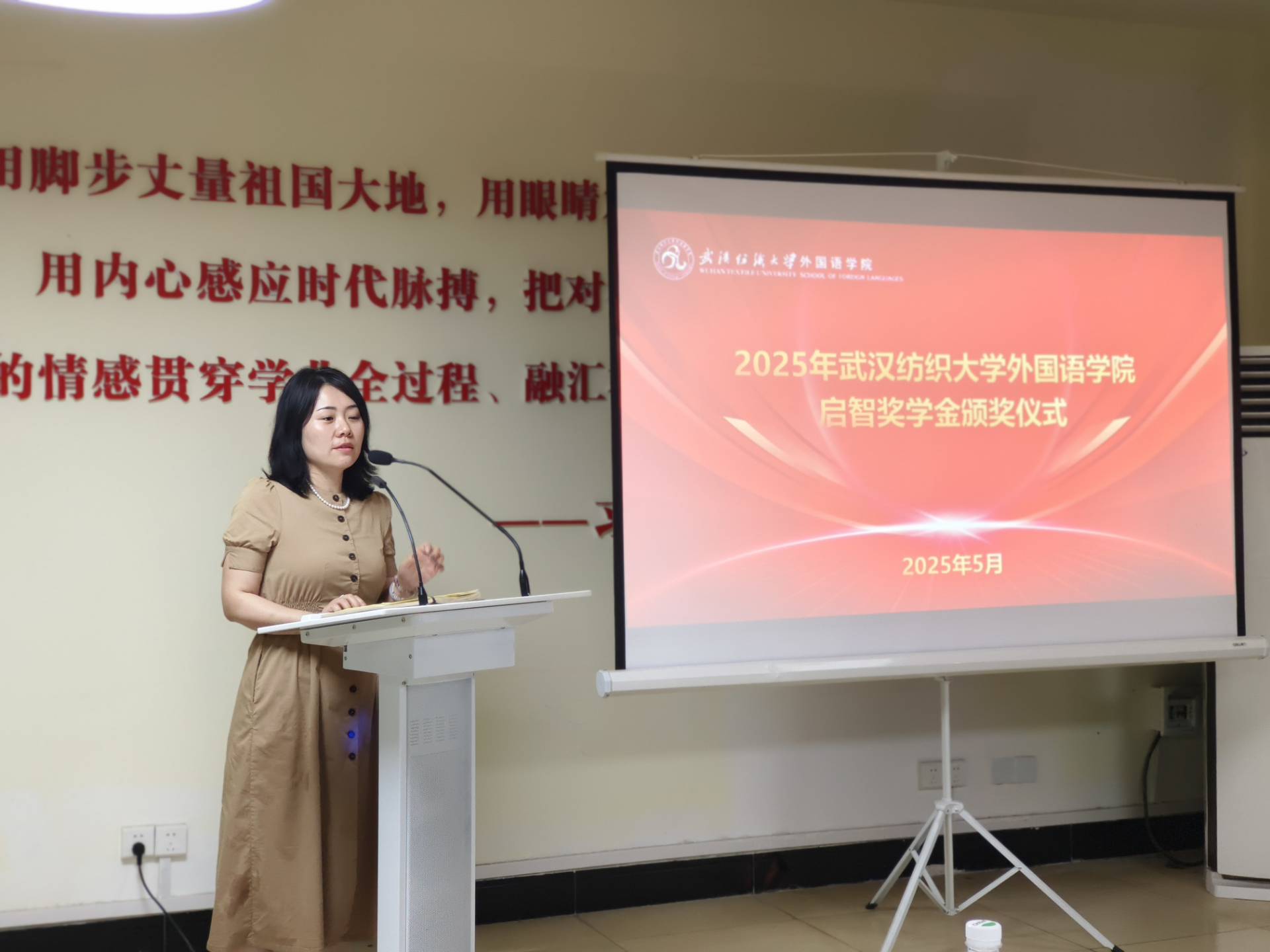 颁奖仪式在庄严而热烈的氛围中拉开帷幕。校友工作与社会合作处副处长崔佳首先致辞,她详细阐述了各类奖学金的设立背景与育人内涵。其中,此次启智奖学金由2005级校友——字节跳动研发高级工程师黄健,于2023年在武汉纺织大学外国语学院捐赠设立。校友设立奖学金的初衷,旨在激励更多的同学积极向上、勇攀高峰,在学业和人生道路上不断追求卓越。
