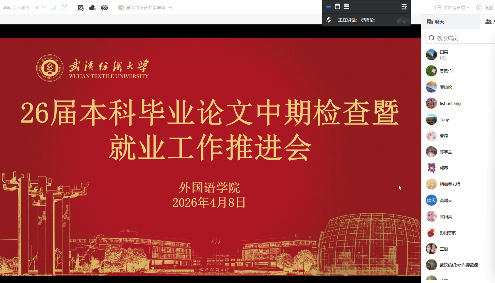 4月8日晚,外国语学院通过线上会议平台召开了26届本科毕业论文中期检查暨就业工作推进会。学院领导、各专业负责人、全体毕业论文指导教师及毕业班辅导员参加了会议。