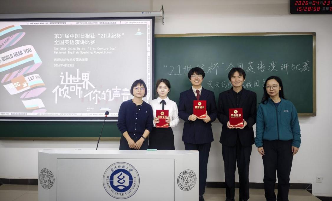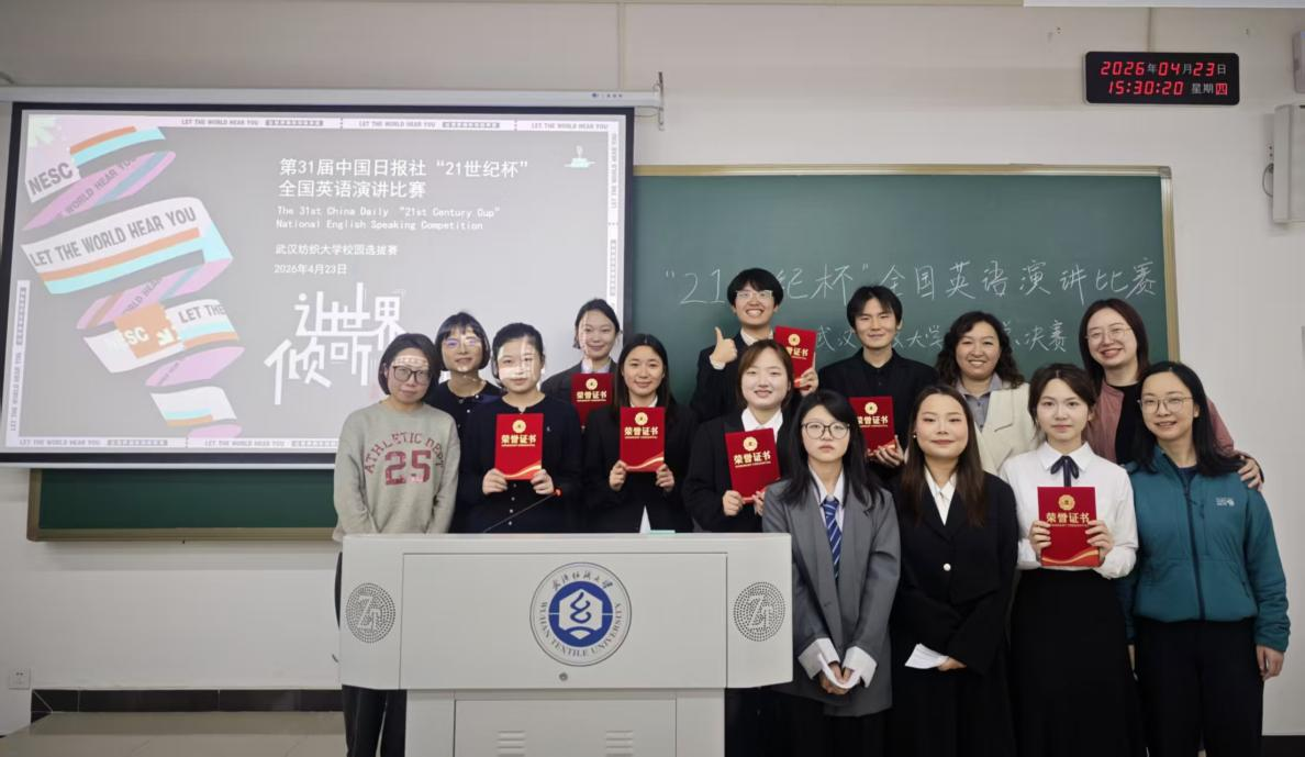 4月23日,第31届中国日报社“21世纪杯”全国大学生英语演讲比赛武汉纺织大学校园决赛在阳光校区成功举行。外国语学院王越、李云霞、刘雅婷、关薇、曹婷五位老师担任评委。本次比赛由中国日报社主办,外国语学院承办,作为年度外语文化节的重要组成活动,旨在提升青年学子讲好中国故事、传播好中国声音的能力。