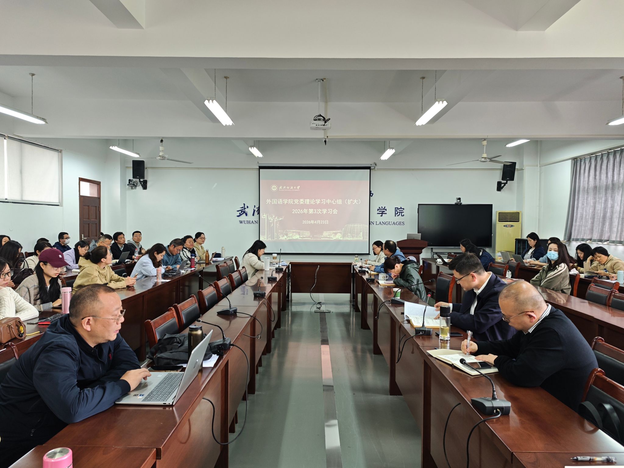 4月23日下午,外国语学院在04-303会议室举办树立和践行正确政绩观学习教育专题读书班暨党委理论学习中心组(扩大)学习会。学院党委书记汪仕辉主持会议,学院班子成员、党委委员、全体教职工参加学习。
