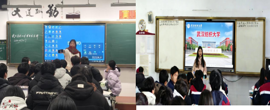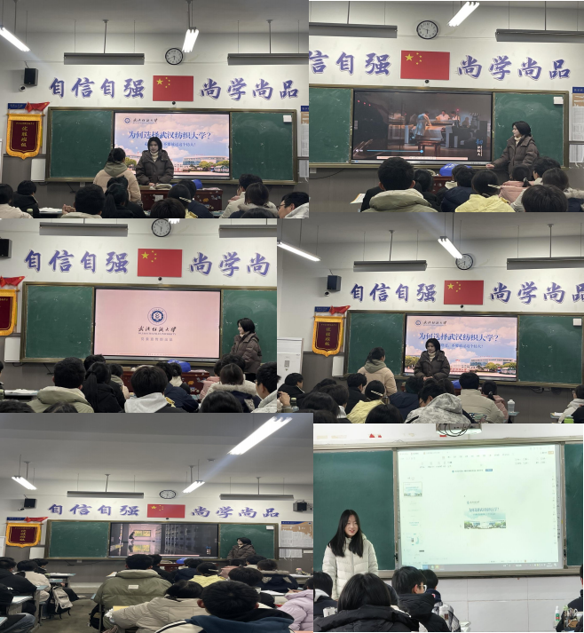 2.现场宣讲与经验分享:两场宣讲均以“最美纺大””为主题开展宣讲。通过精心制作的 PPT,系统介绍了武汉纺织大学的办学特色、优势学科(纺织)、校园环境及学生发展平台。宣讲重点展示了学校的社团文化(招新视频)、品牌校园活动、生活服务设施(宿舍照片)及人文氛围,运用生动图文和真实案例,帮助高中生直观了解纺大生活,激发报考兴趣。