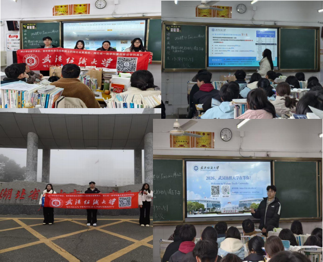 5.学习经验与互动交流:强化联系,营造氛围宣讲过程中注重双向沟通,团队成员主动分享在纺大的学习生活体验,包括课堂趣事、社团活动、校园生活等,鼓励学生表达对大学生活的期待与困惑。轻松活跃的交流氛围增强了学生对武汉纺织大学的亲切感和认同感。