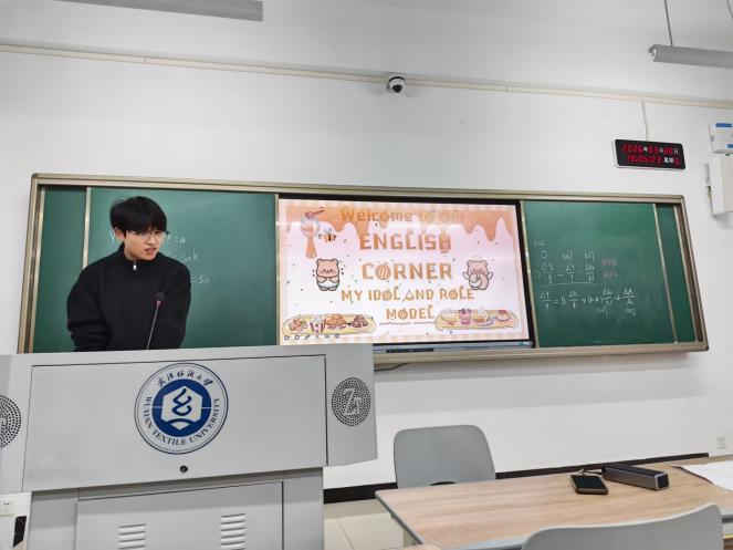 活动伊始,同学们通过“九宫格问答”破冰游戏迅速拉近距离。随后的自我介绍环节采用“石头剪刀布”决定讲述者,新颖的形式缓解了公开表达的紧张感。在核心的“Topic Speech”环节,六位同学依次登台,用英文分享了自己心中的偶像——既有陈都灵、杨紫、迪丽热巴、赵丽颖等演艺明星,也有动画角色懒羊羊。演讲者围绕偶像的吸引力、对自己的影响等角度展开,真情实感与英文表达相得益彰。自由交流环节中,同学们三五成群,围绕偶像与成长话题热烈讨论。活动最后,两位同学演唱了《See you again》《Young and beautiful》等英文歌曲,为整场活动画上圆满句号。